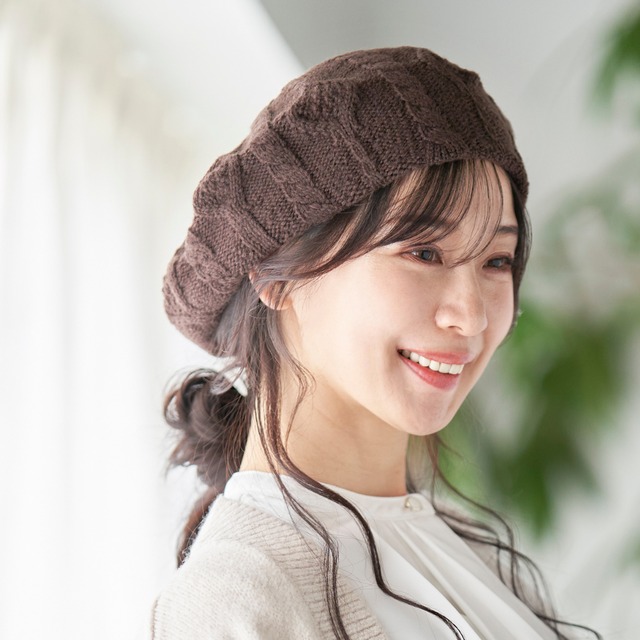 ベレー帽[まるで空気のように、軽くて温かいウール100%]ケーブル編み 縄編み