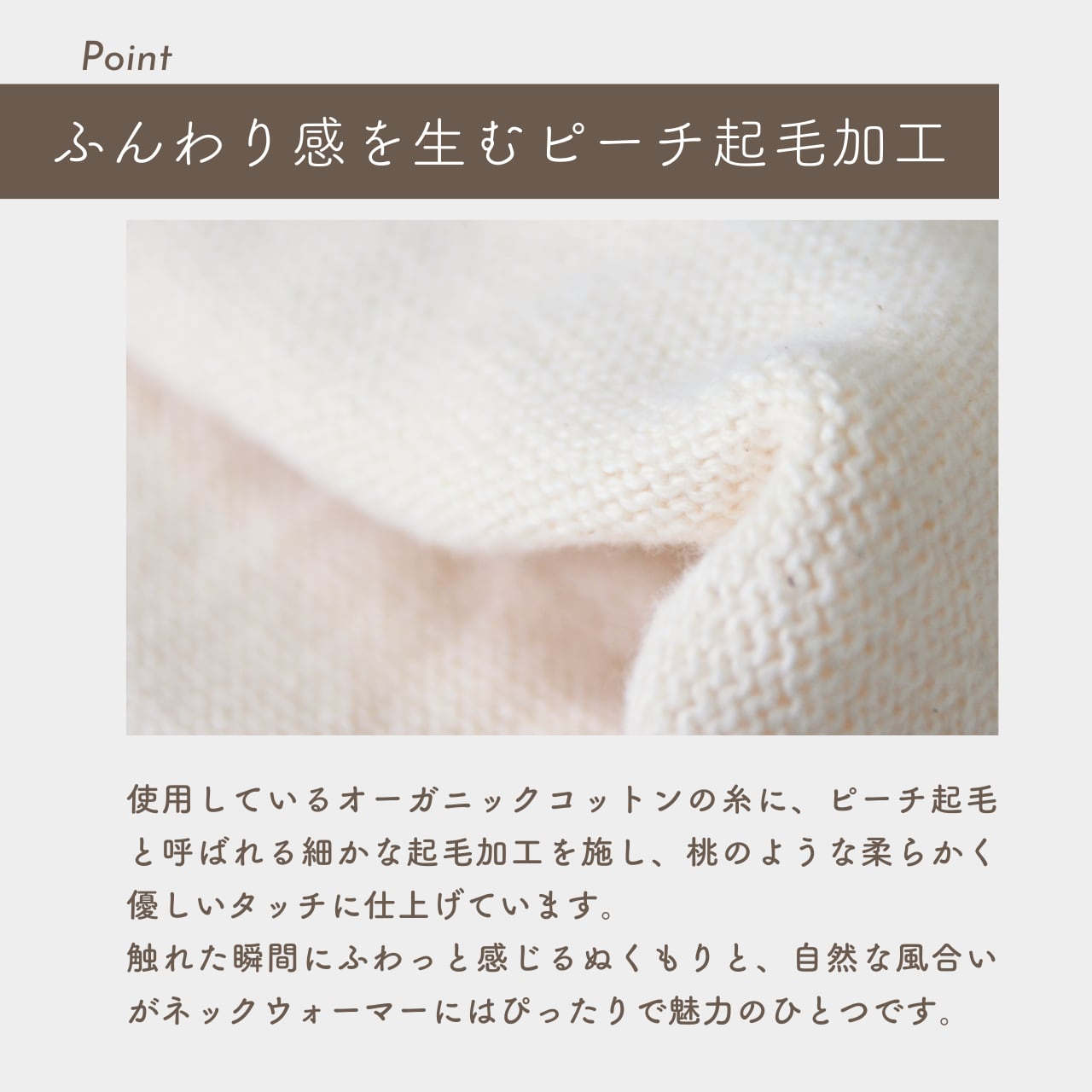 ふんわりとしたピーチ起毛加工を施したオーガニックコットン100%のネックウォーマーです
