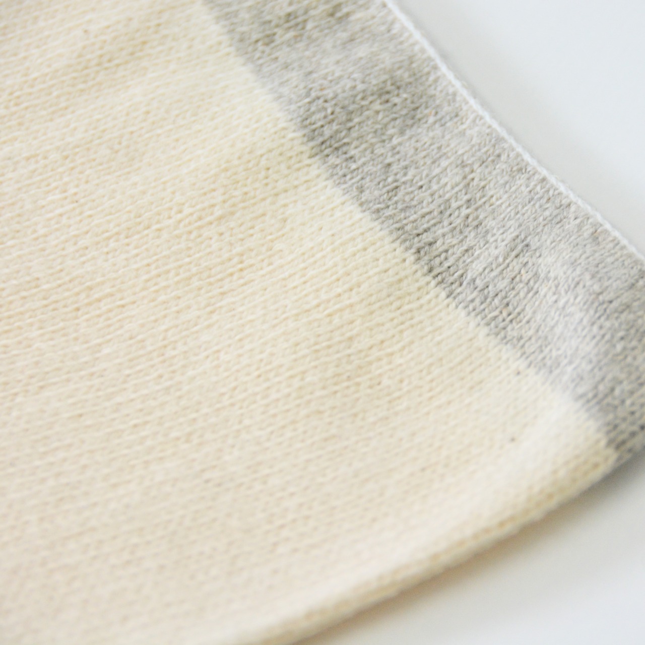 ピーチ起毛とは生地の表面を微起毛させることで、桃の皮のようなソフトな質感を持たせた素材加工を指します。その加工を糸に施すことで、素肌に触れた瞬間にふんわりやさしい肌触りを感じる仕上がりとなっています