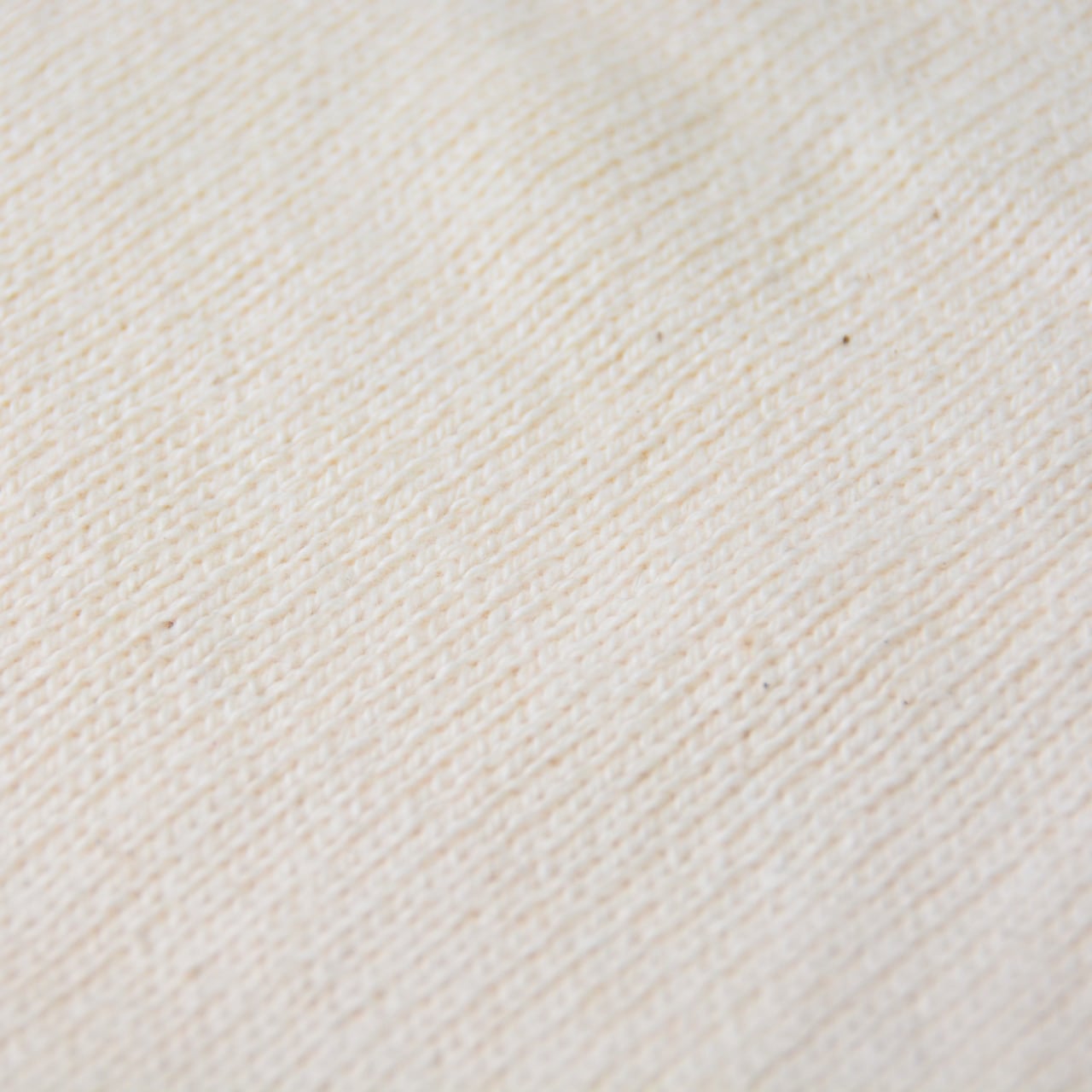 オーガニックコットンは農薬や化学薬品に頼らず育てられたオーガニックコットンを使用しています。生地には、綿花由来の”茶色い粒々”がそのまま残っており、これは葉や茎の細かなかけらが混ざった、自然ならではの風合いです