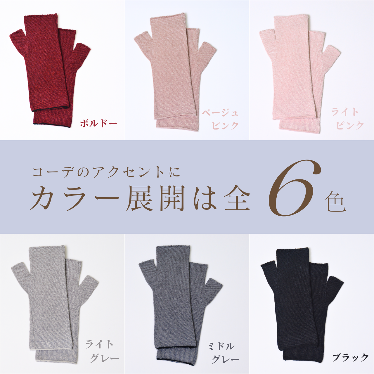 創業69年の撚糸業で培った技術でシルクに伸びる糸を撚糸、独自の糸を使って編み立てたハンドウォーマーはぴったりしていても全く締め付け感のない付け心地を実現しています